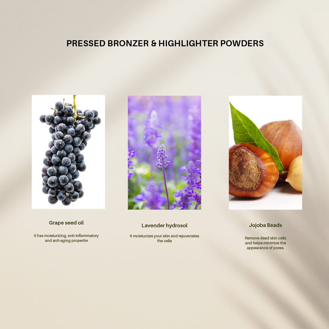 ✨Get a natural sun-kissed glow with our creamy, blendable bronzer & highlighter powders. Infused with organic oils for radiant, healthy-looking skin.